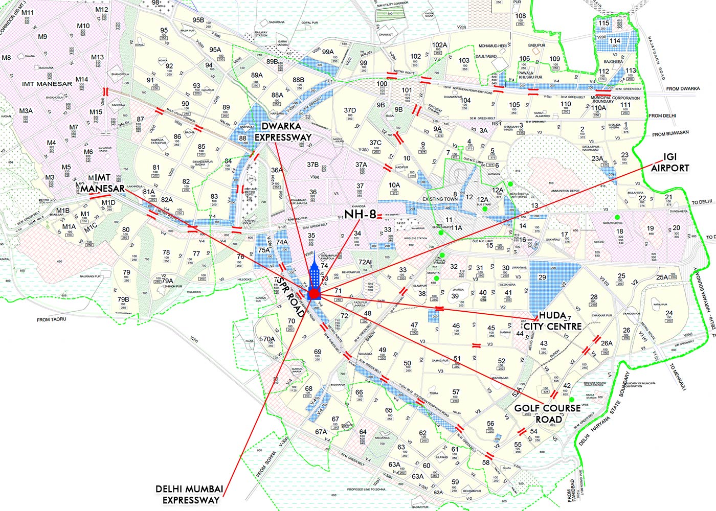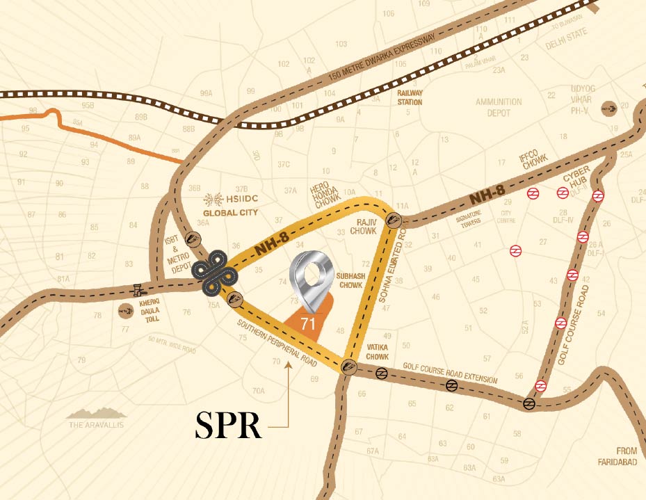 Bang on SPR Road with easy access to NH-8 and 3 Expressways.